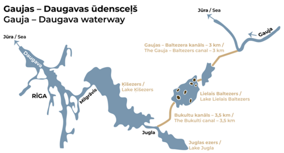 The Gauja-Baltezers Canal was used for rafting only in spring, when the water level in the Gauja was at its highest. The 100 m stretch of the canal downstream of the locks was constructed with wooden boards, as were the walls at the mouth of the canal into the Baltezers. The rest of the section downstream of the locks and the whole section upstream of the locks were reinforced with fascines (bundles of branches tied in a cylindrical shape) or turf. The Gauja-Daugava waterway continued from the Lake Mazais Baltezers through the Lielais Baltezers, and from there, through a 3,5 km long channel and the bed of the Jugla River, the water reached the Ķīšezers and finally, crossing the Ķīšezers and the Mīlgrāvis estuary, reached the Daugava River.