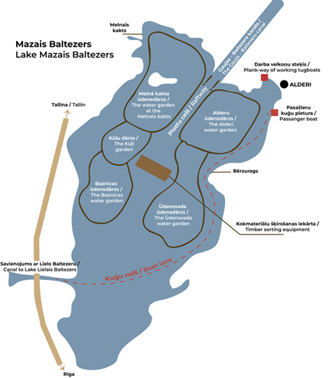 The logs flooded into Lake Baltezers were deposited in water gardens – a part of the lake enclosed by piles and rags – which could hold up to 200 000 cubic metres of logs. In the water gardens, the timber was sorted, felted (joined) and sown in bundles to be towed to Riga by the river shipping tugboat via the Lake Lielais Baltezers and Ķīšezers. There were four water gardens in Mazais Baltezers – Alderi, Melnā kakta (‘Black Corner’), Baznīcas (‘Church’) and Ūdensvada (‘Waterline’). After 1950, when a mechanised tree felling plant was built, the bundles tied there were placed in the bundle water garden. In the middle of these water gardens stood a timber grading plant and a flailing unit.