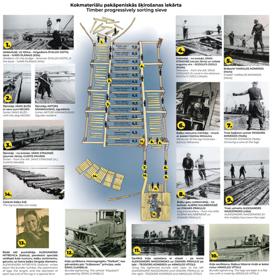 At the lower end of the Gauja-Baltezers Canal, the stream coming from the Gauja ends. Further on, rafts and logs were transported to Riga by tugboats. The rafts were pulled from the mouth of the canal into the lake and tied in the middle of the lake, where they were then towed to Riga – to sawmills, veneer factories and the port. The loose floating logs ended up in water gardens. These enclosure-like gardens were created by attaching single-log sledges to piles. (Log strings are connected by chains and clamps.) The free-floating logs in water gardens were replaced in the 20th century by a series of “log huts”. In the first half of the 20th century, the logs were put into snake rafts, which were also towed by tugboats to Riga. In 1950, a timber sorting plant was built in the Lake Lielais Baltezers. All the logs were sorted into different grades, measured and – with a tractor on the raft – pulled into bundles, which were tied with thick wires by the plankers (tree floaters working in the water gardens). The bundles were made into rejas (2-row caravans of bundles), which were also towed to Riga.