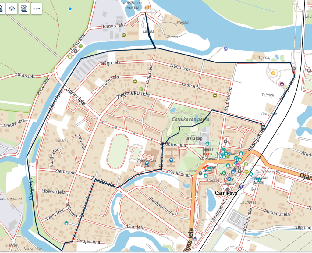 Carnikavas Novadpētniecības centra → Vecgaujas dambis → Pļavu iela → Gaujas iela → Vecgaujas iela → Ziedu iela → Smilšu iela → Nākotnes iela → Parks → Zvejnieku iela → Stacijas iela → Svētku laukums → Gājēju/velosipēdistu tilts → Carnikavas Novadpētniecības centra