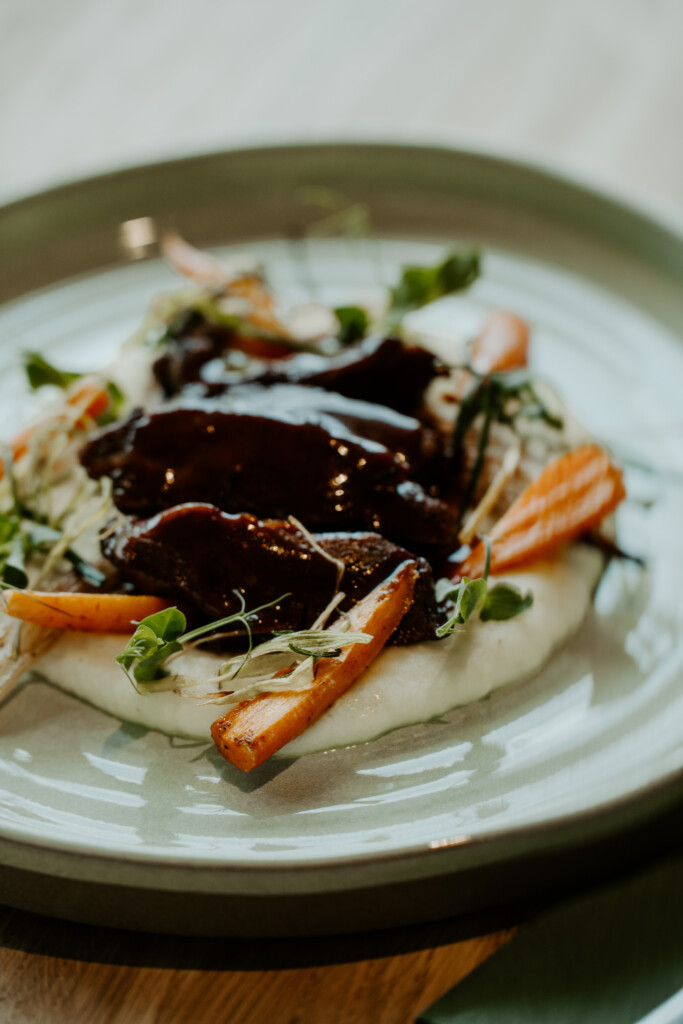 Pamatēdiens. Lēni gatavoti liellopa vaigi, kartupeļu biezenis, karamelizēti burkāni, sarkanvīna mērce. Alergēni: piens — pēc nepieciešamības var precizēt.