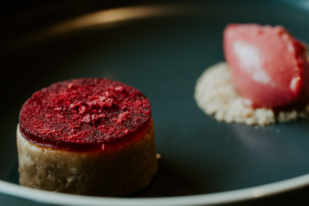 Deserts. Skudru pūznis, aveņu sorberts. Alergēni: olas, piens — pēc nepieciešamības var precizēt.