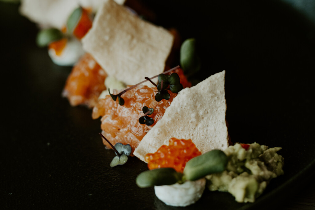 Uzkodas. Laša tartars, mārrutku krēms, foreles ikri, avokado. Alergēni: zivis, piens, olas — pēc nepieciešamības var precizēt.