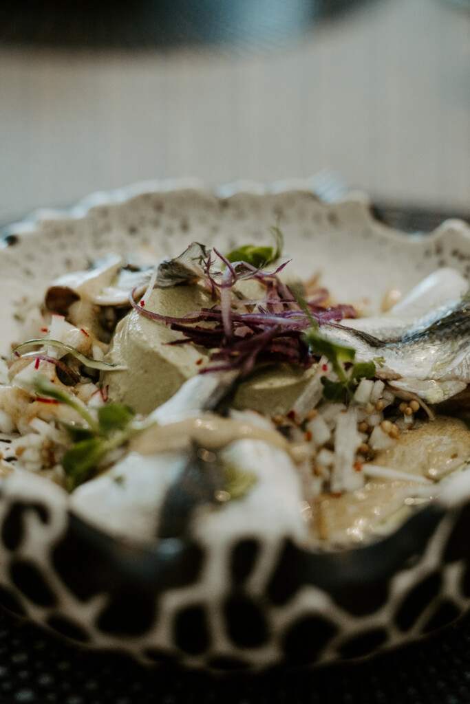 Uzkodas. Marinētas Baltijas reņģes ar laima brulē, ābolu–diļļu salsu un sinepju vinegreta mērci. Alergēni: zivis, piens, olas — pēc nepieciešamības var precizēt.