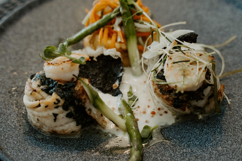 Pamatēdiens. Krāsnī cepta butes fileja, pildīta ar spinātiem, pasniegta ar kāļu pudiņu un baltvīna – foreļu ikru mērci. Alergēni: zivis, piens, olas — pēc nepieciešamības var precizēt.