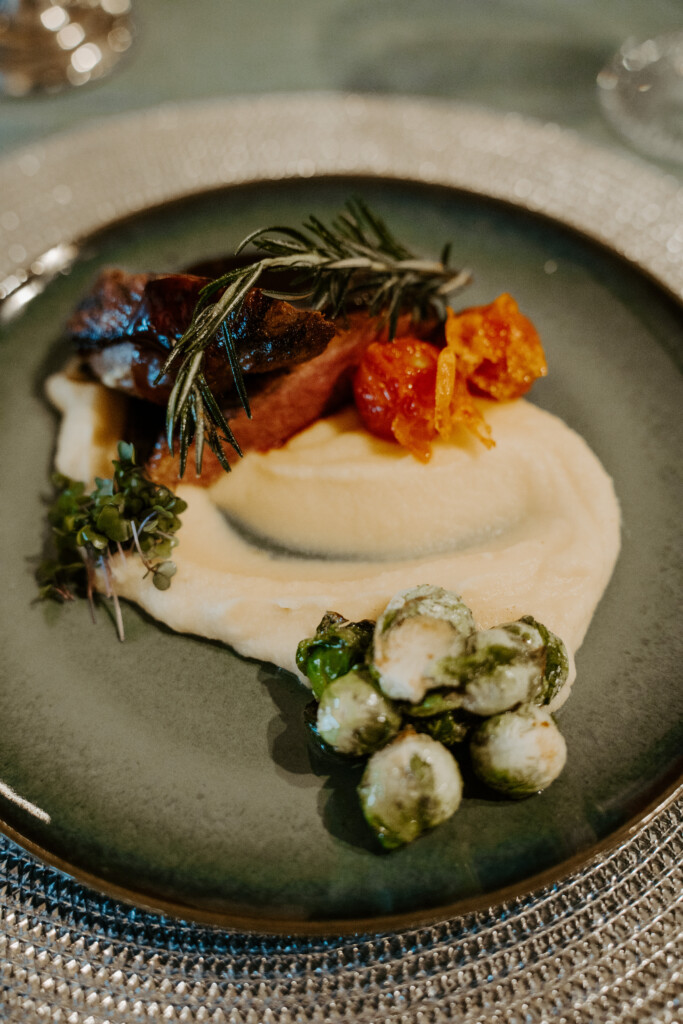 Pamatēdiens. Cepta pīles krūtiņa ar kāļu – ābolu biezeni, ceptiem mazajiem kāpostiem un sarkanvīna – kadiķogu mērci. Alergēni: piens — pēc nepieciešamības var precizēt.