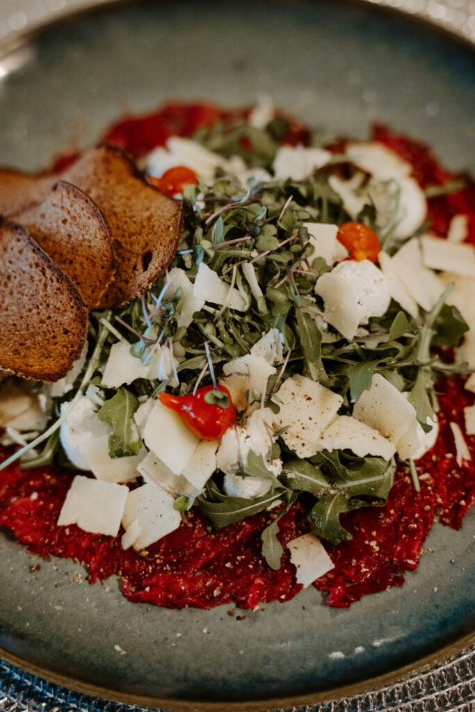 Uzkodas. Vidzemes liellopa filejas karpačio ar rukolu, cieto sieru un mārrutku putām. Alergēni: olas, piens — pēc nepieciešamības var precizēt.